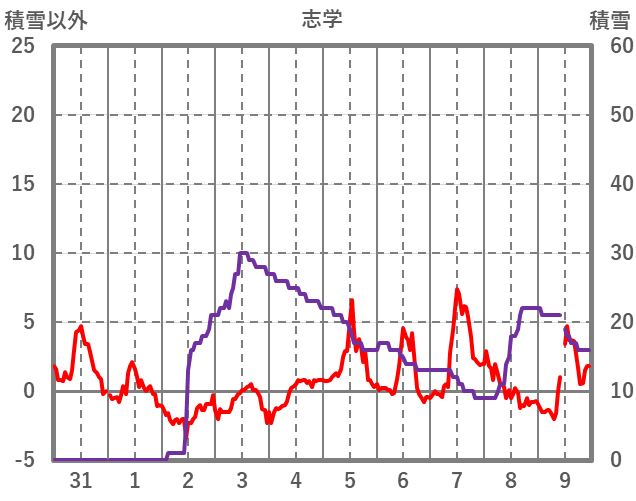 | 日 | 時 | 気温 | 降水 | 風向/風速 | 日照 | 積雪 | 降雪 |