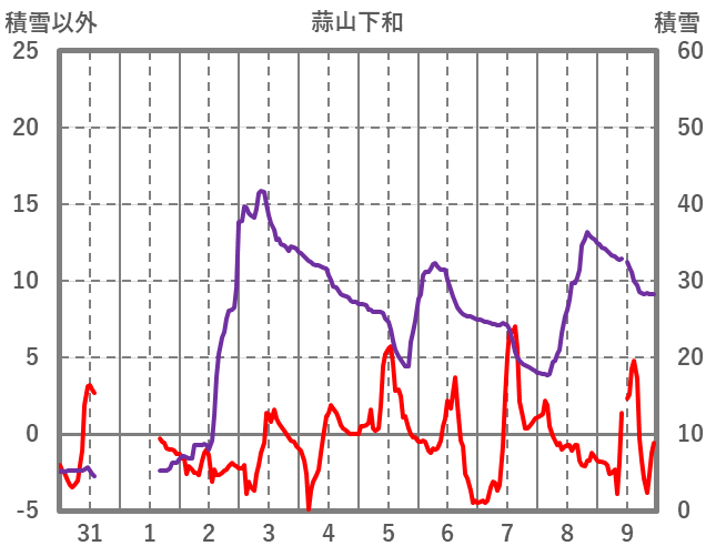 | 日 | 時 | 気温 | 降水 | 風向/風速 | 日照 | 積雪 | 降雪 |