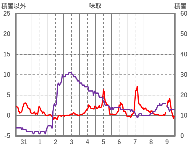 | 日 | 時 | 気温 | 降水 | 風向/風速 | 日照 | 積雪 | 降雪 |