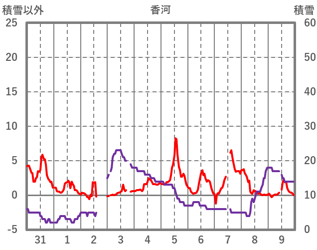 | 日 | 時 | 気温 | 降水 | 風向/風速 | 日照 | 積雪 | 降雪 |