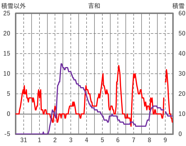 | 日 | 時 | 気温 | 降水 | 風向/風速 | 日照 | 積雪 | 降雪 |