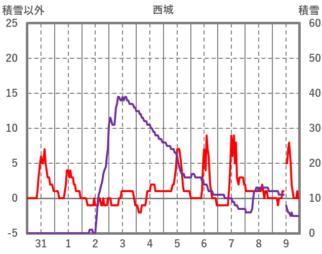 | 日 | 時 | 気温 | 降水 | 風向/風速 | 日照 | 積雪 | 降雪 |