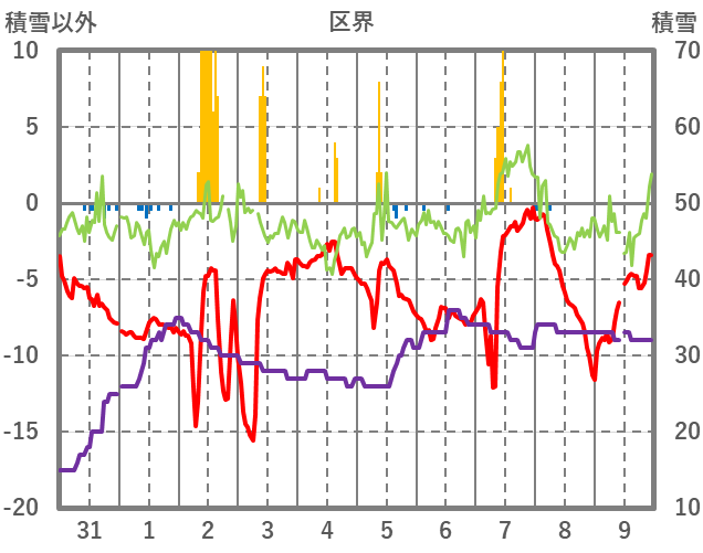 | 日 | 時 | 気温 | 降水 | 風向/風速 | 日照 | 積雪 | 降雪 |
