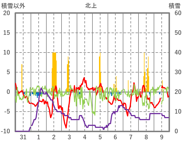 | 日 | 時 | 気温 | 降水 | 風向/風速 | 日照 | 積雪 | 降雪 |