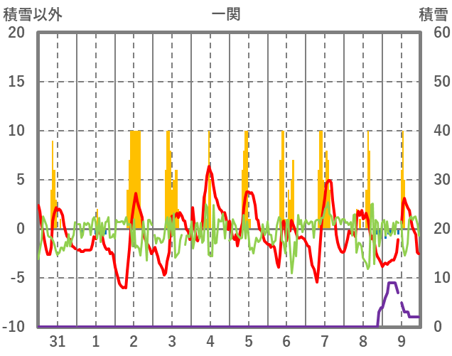 | 日 | 時 | 気温 | 降水 | 風向/風速 | 日照 | 積雪 | 降雪 |