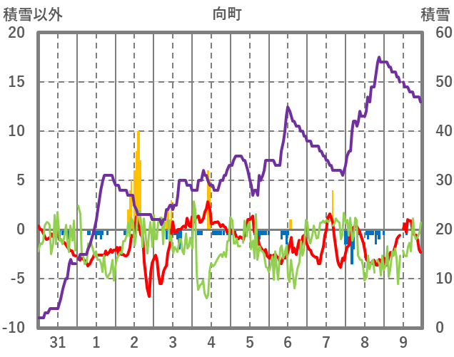 | 日 | 時 | 気温 | 降水 | 風向/風速 | 日照 | 積雪 | 降雪 |