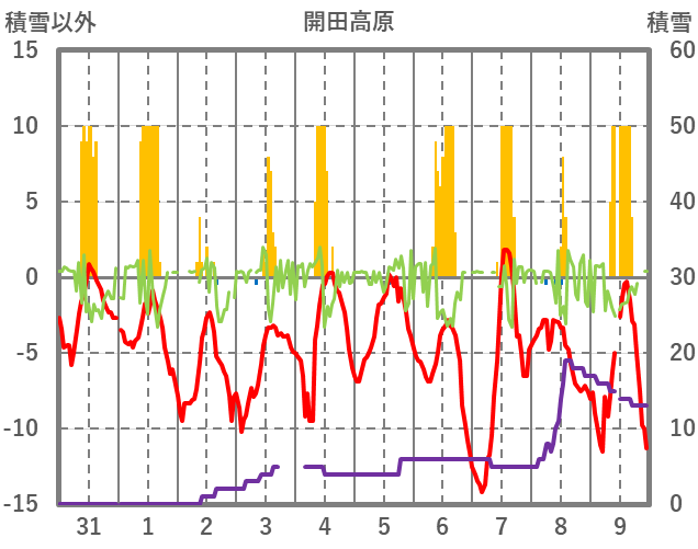 | 日 | 時 | 気温 | 降水 | 風向/風速 | 日照 | 積雪 | 降雪 |