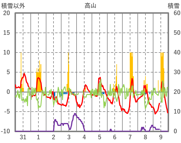 | 日 | 時 | 気温 | 降水 | 風向/風速 | 日照 | 積雪 | 降雪 |