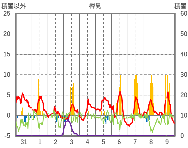 | 日 | 時 | 気温 | 降水 | 風向/風速 | 日照 | 積雪 | 降雪 |
