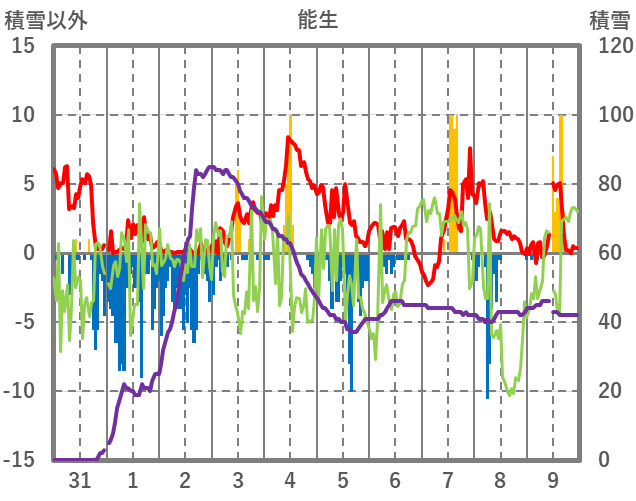 | 日 | 時 | 気温 | 降水 | 風向/風速 | 日照 | 積雪 | 降雪 |