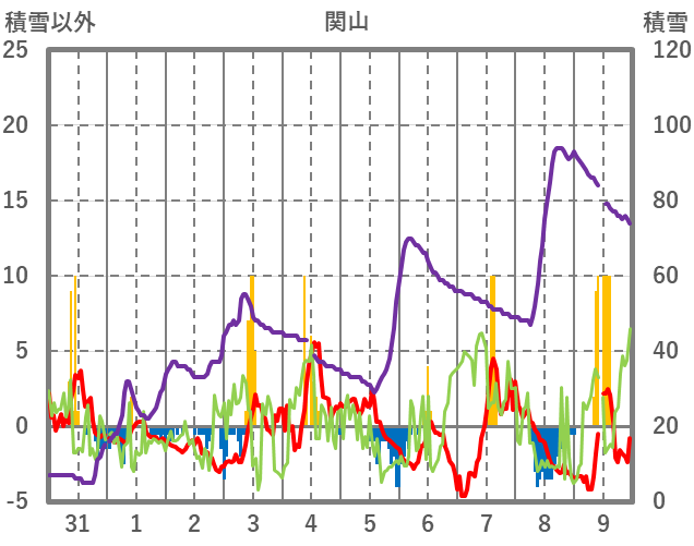 | 日 | 時 | 気温 | 降水 | 風向/風速 | 日照 | 積雪 | 降雪 |