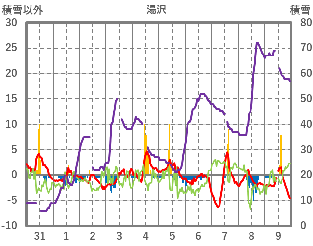 | 日 | 時 | 気温 | 降水 | 風向/風速 | 日照 | 積雪 | 降雪 |