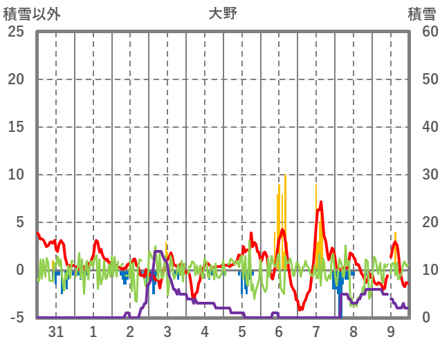 | 日 | 時 | 気温 | 降水 | 風向/風速 | 日照 | 積雪 | 降雪 |