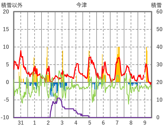 | 日 | 時 | 気温 | 降水 | 風向/風速 | 日照 | 積雪 | 降雪 |