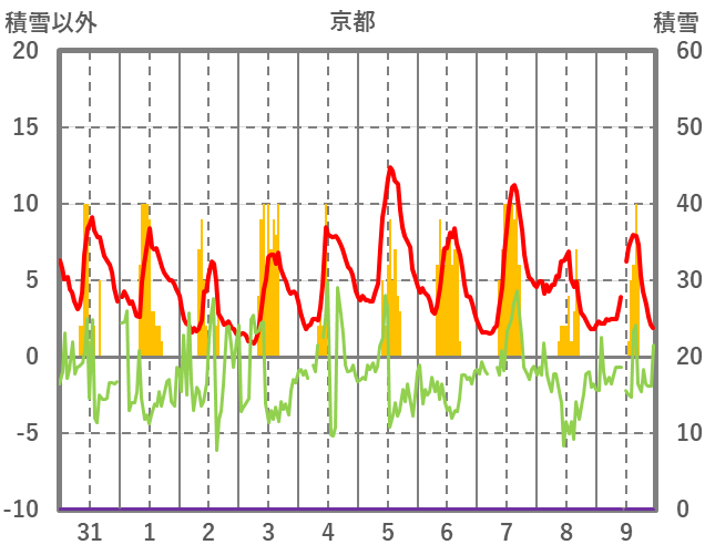 | 日 | 時 | 気温 | 降水 | 風向/風速 | 日照 | 積雪 | 降雪 |