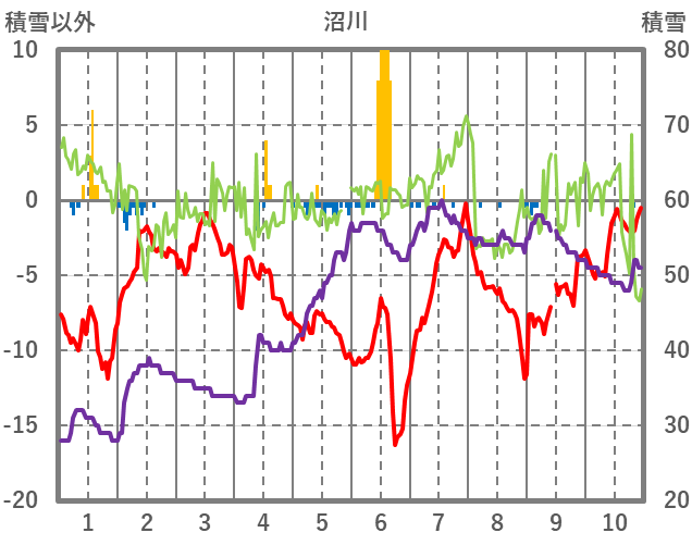 | 日 | 時 | 気温 | 降水 | 風向/風速 | 日照 | 積雪 | 降雪 |