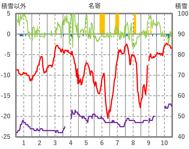| 日 | 時 | 気温 | 降水 | 風向/風速 | 日照 | 積雪 | 降雪 |