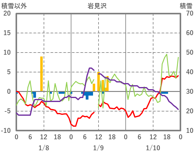 | 日 | 時 | 気温 | 降水 | 風向/風速 | 日照 | 積雪 | 降雪 |