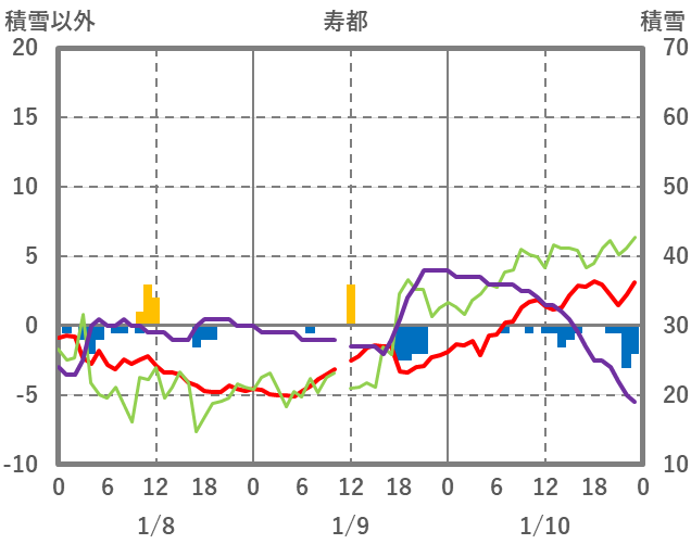 | 日 | 時 | 気温 | 降水 | 風向/風速 | 日照 | 積雪 | 降雪 |