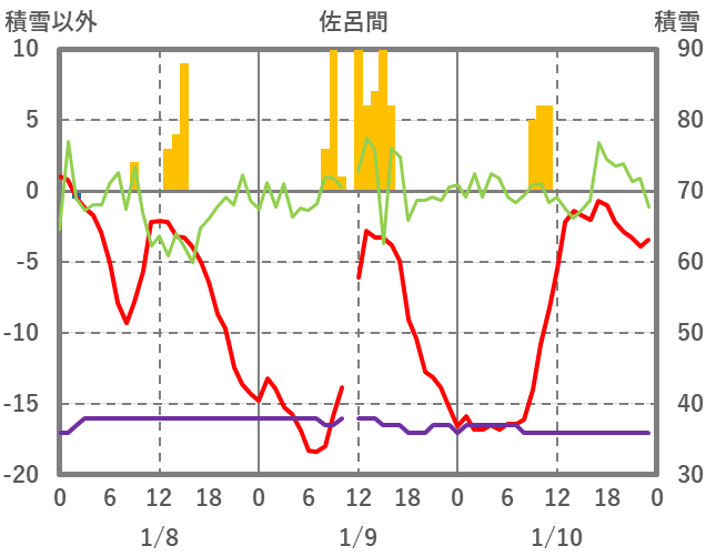 | 日 | 時 | 気温 | 降水 | 風向/風速 | 日照 | 積雪 | 降雪 |