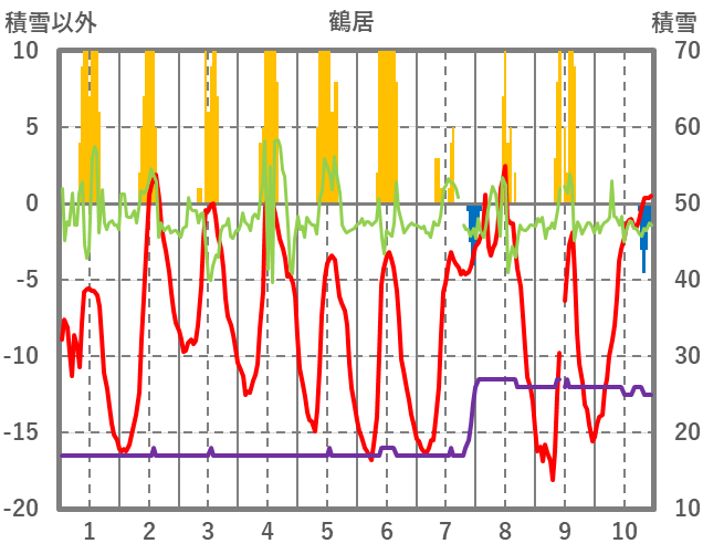 | 日 | 時 | 気温 | 降水 | 風向/風速 | 日照 | 積雪 | 降雪 |