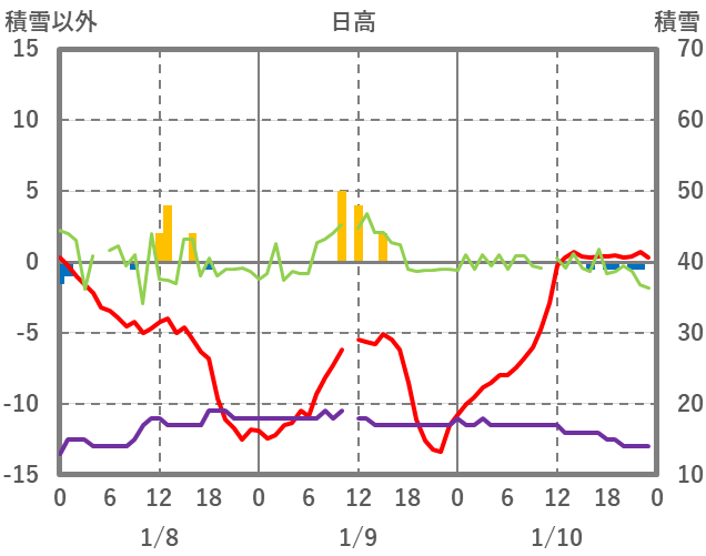 | 日 | 時 | 気温 | 降水 | 風向/風速 | 日照 | 積雪 | 降雪 |