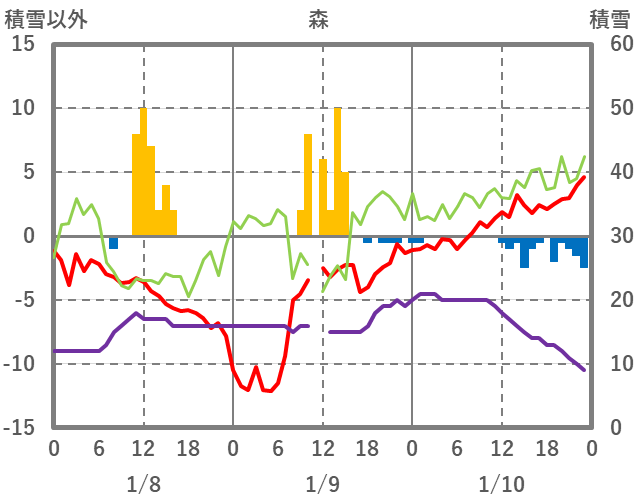 | 日 | 時 | 気温 | 降水 | 風向/風速 | 日照 | 積雪 | 降雪 |
