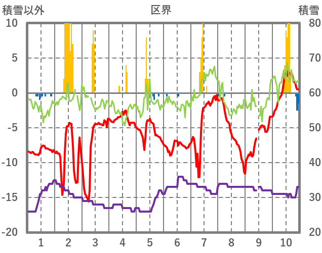| 日 | 時 | 気温 | 降水 | 風向/風速 | 日照 | 積雪 | 降雪 |