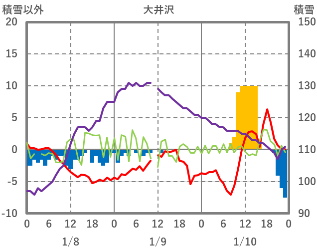 | 日 | 時 | 気温 | 降水 | 風向/風速 | 日照 | 積雪 | 降雪 |