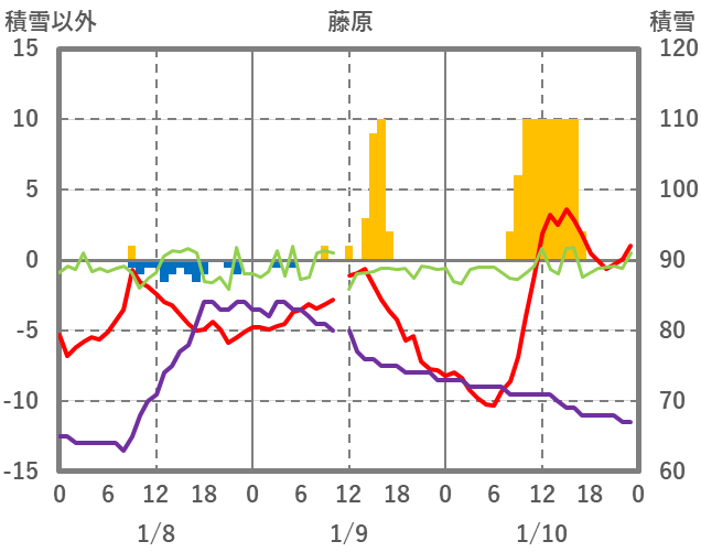 | 日 | 時 | 気温 | 降水 | 風向/風速 | 日照 | 積雪 | 降雪 |