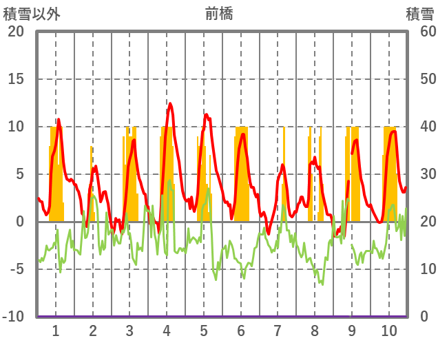 | 日 | 時 | 気温 | 降水 | 風向/風速 | 日照 | 積雪 | 降雪 |