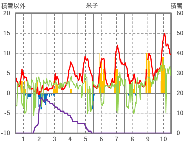 | 日 | 時 | 気温 | 降水 | 風向/風速 | 日照 | 積雪 | 降雪 |