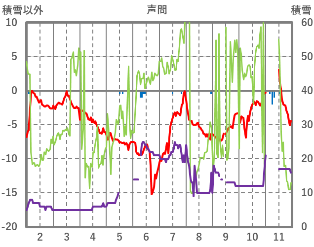 | 日 | 時 | 気温 | 降水 | 風向/風速 | 日照 | 積雪 | 降雪 |