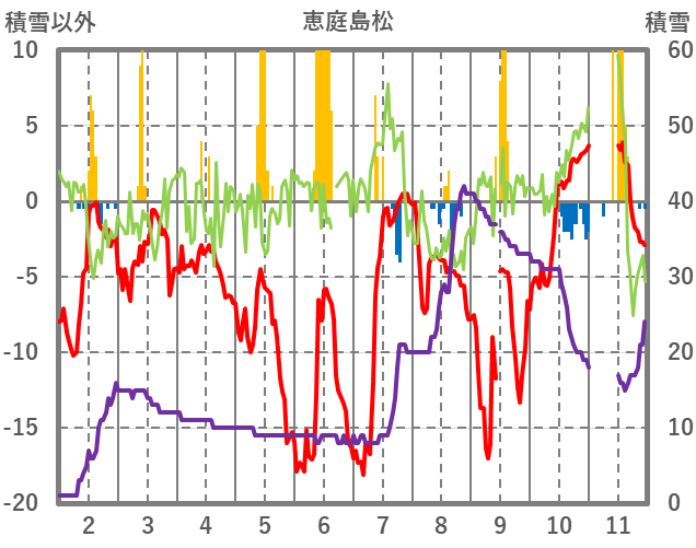 | 日 | 時 | 気温 | 降水 | 風向/風速 | 日照 | 積雪 | 降雪 |
