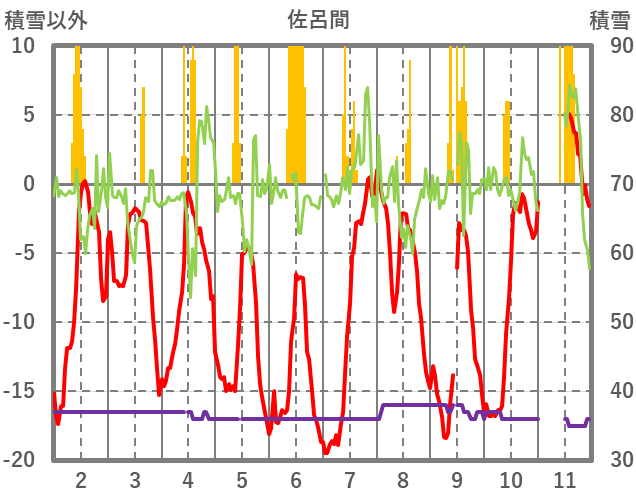 | 日 | 時 | 気温 | 降水 | 風向/風速 | 日照 | 積雪 | 降雪 |