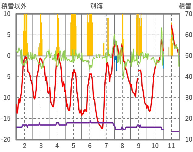 | 日 | 時 | 気温 | 降水 | 風向/風速 | 日照 | 積雪 | 降雪 |
