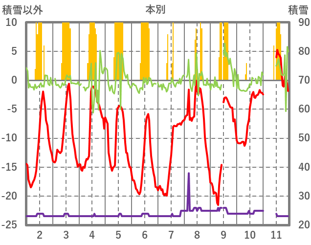 | 日 | 時 | 気温 | 降水 | 風向/風速 | 日照 | 積雪 | 降雪 |