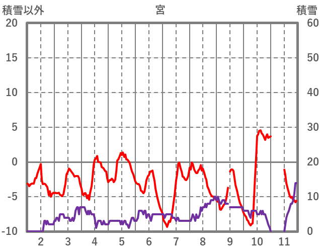 | 日 | 時 | 気温 | 降水 | 風向/風速 | 日照 | 積雪 | 降雪 |