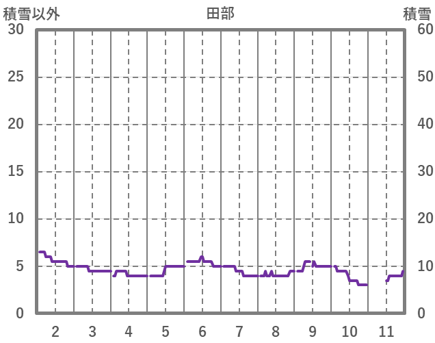 | 日 | 時 | 気温 | 降水 | 風向/風速 | 日照 | 積雪 | 降雪 |