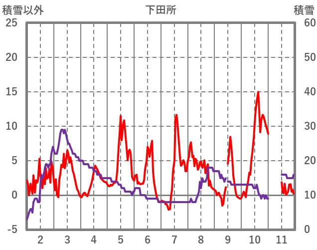 | 日 | 時 | 気温 | 降水 | 風向/風速 | 日照 | 積雪 | 降雪 |
