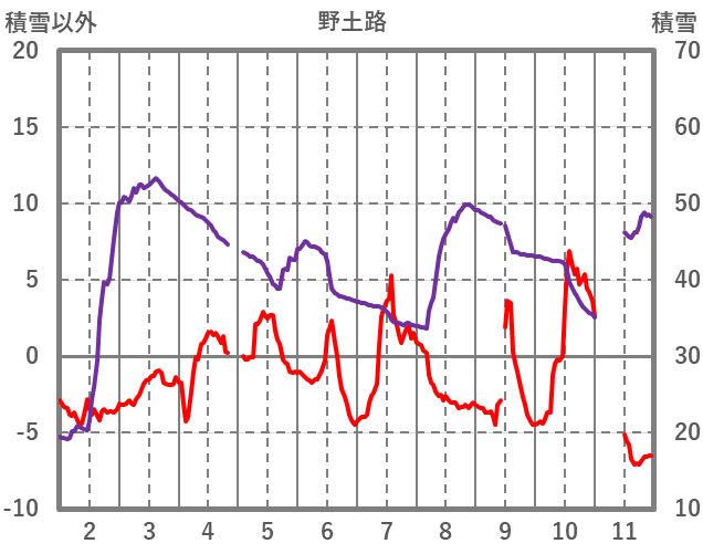 | 日 | 時 | 気温 | 降水 | 風向/風速 | 日照 | 積雪 | 降雪 |