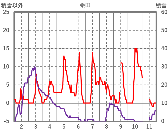 | 日 | 時 | 気温 | 降水 | 風向/風速 | 日照 | 積雪 | 降雪 |