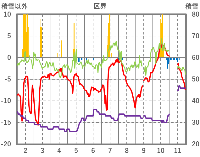 | 日 | 時 | 気温 | 降水 | 風向/風速 | 日照 | 積雪 | 降雪 |