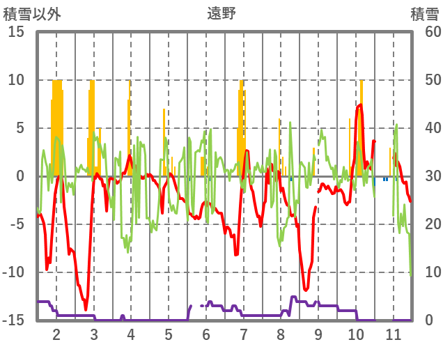 | 日 | 時 | 気温 | 降水 | 風向/風速 | 日照 | 積雪 | 降雪 |