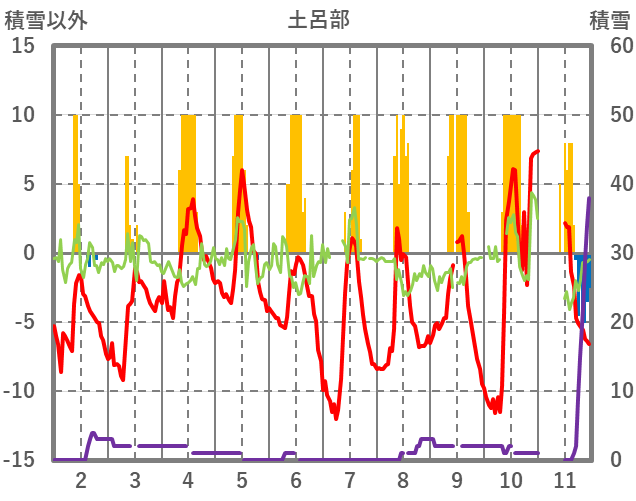 | 日 | 時 | 気温 | 降水 | 風向/風速 | 日照 | 積雪 | 降雪 |