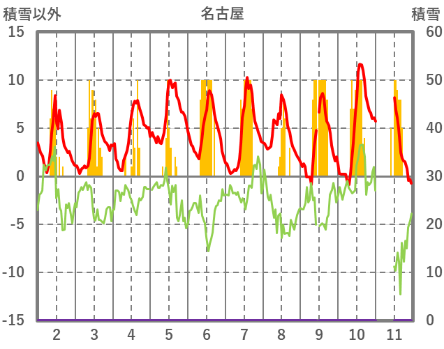 | 日 | 時 | 気温 | 降水 | 風向/風速 | 日照 | 積雪 | 降雪 |