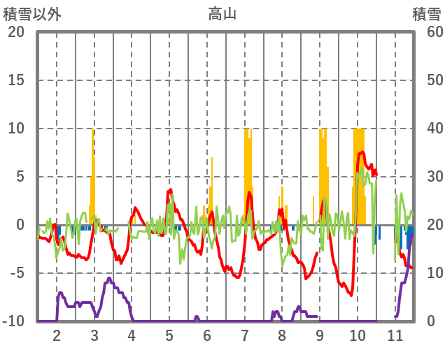 | 日 | 時 | 気温 | 降水 | 風向/風速 | 日照 | 積雪 | 降雪 |