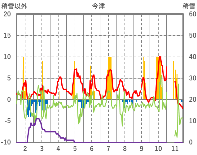 | 日 | 時 | 気温 | 降水 | 風向/風速 | 日照 | 積雪 | 降雪 |