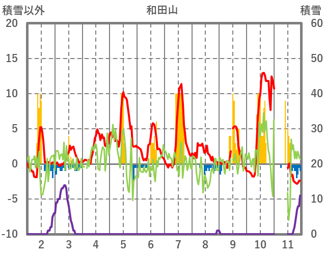 | 日 | 時 | 気温 | 降水 | 風向/風速 | 日照 | 積雪 | 降雪 |
