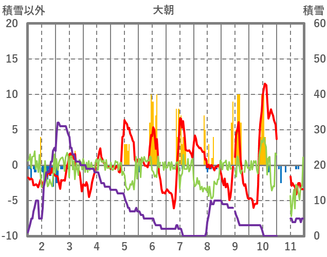 | 日 | 時 | 気温 | 降水 | 風向/風速 | 日照 | 積雪 | 降雪 |